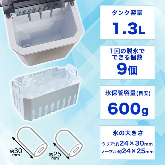 タンク容量は1.3L、氷保管容量は約600g(保冷機能なし)。