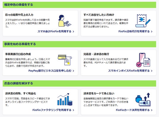 開業後は「スマホ会計FinFin」や「スマホインボイスFinFin」を活用することで、開業後の会計管理から請求書作成、確定申告まで対応可能。また、PayPay銀行とも連携しているため、事業用の口座開設もスムーズに行うことができます。さらに、会計バンク提供のファクタリングサービスや請求書後払いサービスにもスマホでお申込みいただけるため、事業運営における資金繰りのサポートまでワンストップで完結します。