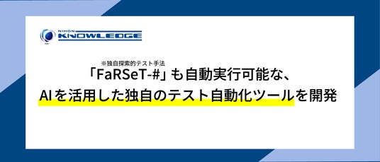 日本ナレッジ株式会社(本社:東京都台東区寿、代表取締役社長:藤井 洋一、以下日本ナレッジ)は、機械学習を活用した独自探索的テスト手法「FaRSeT-#」の自動実行も可能とする、独自のテスト自動化ツールのリリースについてお知らせいたします。