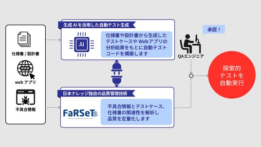 本ツールでは、テストケースや自動テストコードの自動生成機能を活用し、当社の独自技術である「探索的テストFaRSeT(ファルセット)」を自動実行することが可能になります。