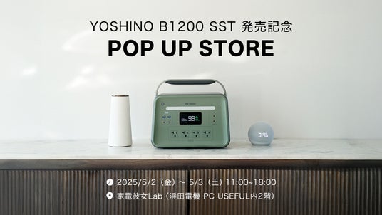 株式会社ヨシノパワージャパン(本社:東京都中央区、代表取締役:桜田徹)は、2025年4月17日に発表した世界最小クラス(※1)の1kWh容量ポータブル電源『YOSHINO B1200 SST』の発売を記念し、2025年5月2日(金)から5月3日(土)の2日間、東京・秋葉原にてポップアップストアを開催いたします。本イベントでは、三元固体電池(R)を搭載したB1200 SSTの実機展示、体験ブース、スマートフォン無料充電サービスを提供。先着200名様にはオリジナルAC-USB電源アダプターをプレゼントいたします。
