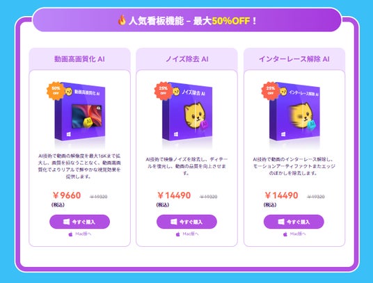 最安値で看板製品を入手今回の特別セールはスピナー抽選ゲーム以外、多様な製品割引もユーザーに提供します。まず、複数アイテムのコンボパッケージーーUniFabシリーズ全製品で組み合わせたUniFab オールインワンは、スピナーゲームで獲得したクーポン券に重ねて、45%割引でライフタイムバージョンを購入でき、最大37460円の割引になります。そして、今年登場したばかりの新品2品:顔向け高画質化 AIや白黒動画カラー化 AIを30%割引、人気単品3品:動画高画質化 AI、ノイズ除去 AI、インターレース解除 AIを25%から50%までの割引で購入することができます。