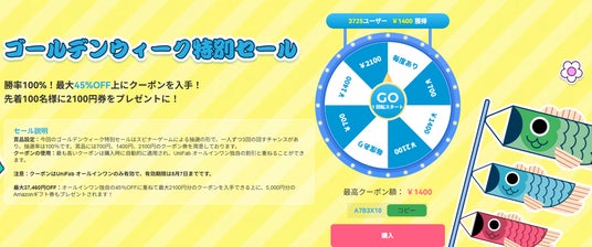 スピナー抽選ゲーム:当選率100%UniFabゴールデンウイーク特別セールは、スピナー抽選ゲームの形式でユーザーにクーポン券をプレゼントします。プロモーションページ内のスピナーゲームに参加すると、700円、1,400円、そして最大2,100円分のクーポンを獲得できます。先着の100名には最大値の2100円券を100%入手できます。1名のユーザーには3回の抽選チャンスがあり、獲得したクーポン券はUniFab オールインワン (ライフタイム)の購入に使用できる上に、UniFab オールインワン独自の45%割引と重ねることも可能です。