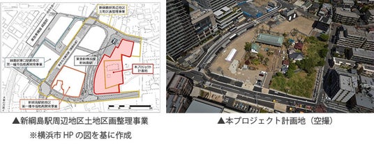 横浜市施行の新綱島駅周辺地区土地区画整理事業では、新綱島駅周辺地区の約2.7haにおよび、綱島街道をはじめとする車道や歩道の拡幅、バスやタクシー乗り場、公共駐輪場、交流を育む広場の設置など、街のインフラ整備が進んでいます。その中で本プロジェクトは、新綱島駅前の個人所有の敷地において進めるものです。
