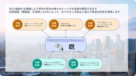 このような課題を解決するため、NECでは、長年培ってきた生体認証技術を活用したVCによる分散型アイデンティティ(注3)の認証・本人確認の基盤整備に取り組んでいます。