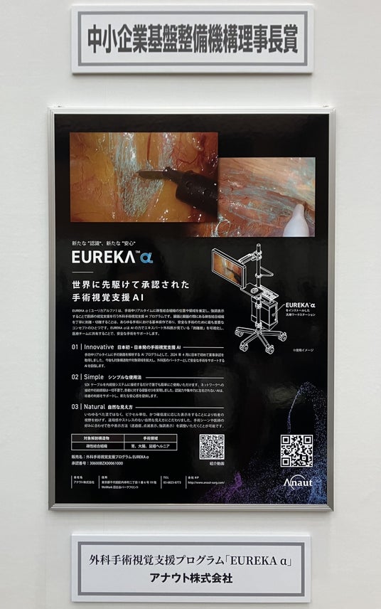 と、東京大学名誉教授 新井民夫審査委員長からご講評いただき、受賞者代表挨拶では、起業後の現在も月に数回外科医として手術室に立つ代表の小林が、多くの患者さんが手術に不安を感じる原因となる、手術をしたことでおこる悪影響(手術合併症)を少しでも減らして世界中の患者さんに今まで以上の安心と安全を届けたいという「EUREKA α(ユーリカアルファ)」開発の思いをスピーチいたしました。
