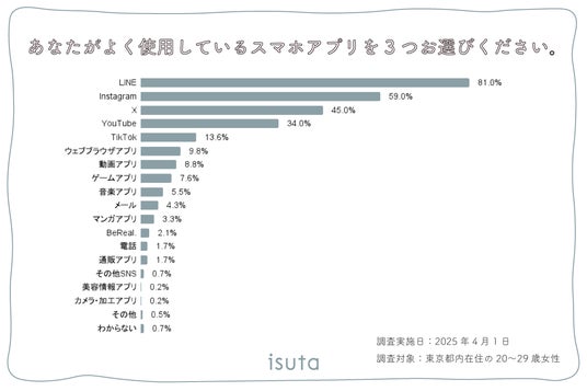 よく使用しているスマホアプリに関しては、LINE、Instagram、X、YouTubeが圧倒的に多く、ウェブブラウザを挙げた人は全体の10%にも満たないという結果でした。