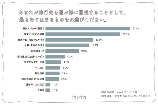 旅行先を選ぶ際に重視することとしては、「観光スポットの豊富さ」「食文化・地元の料理」が上位にランクイン。Z世代の旅行者は体験価値を重視し、“その土地ならではの魅力”を求めていると言えるかもしれません。