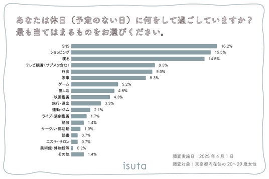 isutaは、「私の“好き”にウソをつかない。」というコンセプトのもと、他人の物差しではなく“私”が毎日しあわせでいられるための情報を、WebメディアやInstagram、TikTok等のSNSを通して日々発信しています。昨今、私たちのコンテンツの中で体験系の情報にユーザーの関心が高まってきており、特にお出かけスポットや旅行先のアイデアは、SNSでのエンゲージメント率が高い傾向があります。そこでisutaでは、トレンドに敏感で情報感度が高い都内在住の20代女性を対象に、旅行と休日の過ごし方、およびデジタルライフに関するアンケートを実施しました。