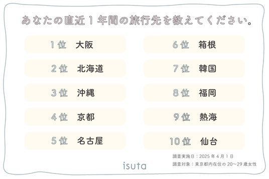 株式会社PR TIMES(本社:東京都港区、代表取締役:山口 拓己、東証プライム:3922)が企画・運営を手掛けるZ世代向けメディア「isuta(イスタ)」は、東京都内在住の20~29歳の女性420人を対象に、旅行・お出かけに関するトレンド調査を2025年4月1日に実施いたしました。isutaでは、Z世代女性のリアルなライフスタイルを紐解き、コンテンツへの反映と企業向けのマーケティング支援に貢献することを目指し、Z世代の実態を深ぼる調査を今後も継続的におこなってまいります。