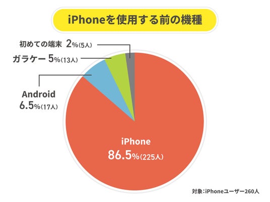 現在iPhoneを使っている人を対象に買い替え前の機種を調査すると、iPhoneからiPhoneへ買い替えた人は86.5%とほとんどを占めます。