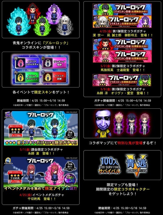 青鬼オンラインに、TVアニメ『ブルーロック』のキャラクターが青鬼オンラインのコラボスキンとして登場!