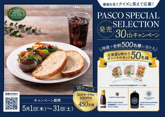 敷島製パン株式会社(Pasco)は『PASCO SPECIAL SELECTION 発売30th』キャンペーンを、2025年5月1日(木)~5月31日(土)の31日間実施します。抽選で「北海道を味わうオリジナルセット」が当たるほか、Wチャンスとして「QUOカードPay(500円分)」もご用意!専用サイトから、動画を見てクイズに答えてご応募ください。