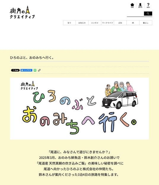 株式会社 街クリ(本社:東京都中央区、代表取締役社長:田中泰延)は、尾道特集 特設ページ「ひろのぶと、おのみちへ行く。」をWebマガジン『街角のクリエイティブ』で4月25日にオープンしました。