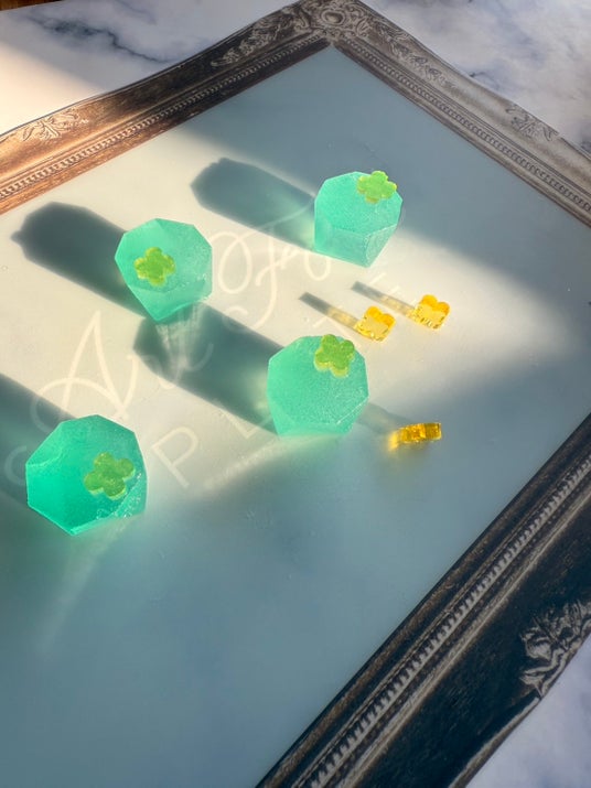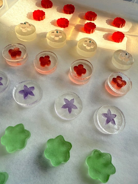 手前から淡い緑の梅、透明(乾燥すると白)のジャスミン、濃い赤はあまおう苺味