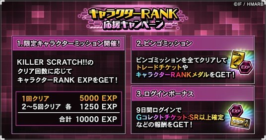 期間中、キャラクターRANK EXPを各キャラクター最大10,000獲得できるキャラクターミッションをはじめ、ビンゴミッションやログインボーナスを開催しています。期間中、7日ログインで「Gコレクトチケット:SR以上確定」などの報酬を入手できます。詳細はアプリ内お知らせをご確認ください。