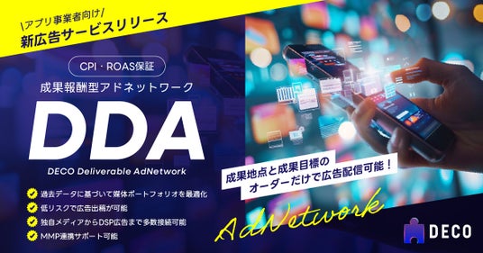 株式会社凸(デコ)(本社:東京都渋谷区、代表取締役:長谷川秀樹、以下 凸)は、アプリプロモーションに特化した成果報酬型アドネットワーク「DECO Deliverable AdNetwork(以下「DDA」)」を新たに提供開始したことをお知らせします。本サービスは、CPI・ROAS保証付きのマルチメディア配信を低リスクで実現し、限られたプロモーション予算内でも効率的にコアユーザーの獲得を目指すアプリ事業者を支援します。