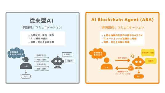 ABA: 人間は抽象的な目標のみ(例:資産を増やしてほしい)を設定し、AIがその目的達成のために「資金(ウォレット)」と「実行手段(スマートコントラクト・スマートウォレット)」を伴って自律的に行動する「非同期型」エージェント