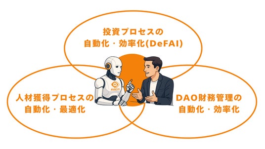 - 投資プロセスの自動化・効率化(DeFAI)「利益を最大化して」といった投資の方向性を指示するだけで、ABAが市場分析から銘柄選定、資金配分、取引実行、リバランスまでを24時間365日休まず自律的に完結します。人間は戦略的な意思決定のみに集中できるようになるほか、人間の感情や認知バイアスに左右されない理想的な投資を実現します。- DAO財務管理の自動化・効率化ブロックチェーン上で運営される分散型自律組織(DAO: Decentralized Autonomous Organization)の資金管理も「コミュニティの成長に最適な財務運用を」という指示一つで、ABAが財務運用を自律的に実行し、透明性と効率を両立した自動運用を提供します。運営の承認プロセスが劇的に簡素化されます。