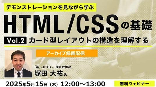 株式会社クリーク・アンド・リバー社(C&R社)は5月15日(木)、Webデザイナー、コーダーの方や専門学校やスクールでWebの勉強をされている方を対象に、2024年10月に開催したオンラインセミナー「デモンストレーションを見ながら学ぶ HTML/CSSの基礎(2)~カード型レイアウトの構造を理解する~」のアーカイブ映像を無料配信します。