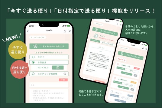 もしものときに届ける、想いと情報の自動送信サービス「ことばの保険 tayorie」が、新たに“今すぐ送る便り”と“日付指定で送る便り”の2機能を追加。若年層のあいだで自然に広がる“前向きな終活”の第一歩として、新たな使い方を提案します。