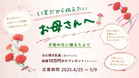 母親に宛てて書いた便りのプレビュー画面をスクリーンショットし、ハッシュタグ「#母の日に贈るたより」をつけてSNSに投稿していただいた方の中から、心温まる便りを書いてくださった6名様にAmazonギフトカードをプレゼントいたします。(最優秀賞:1名に5万円分、優秀賞:5名に1万円分)