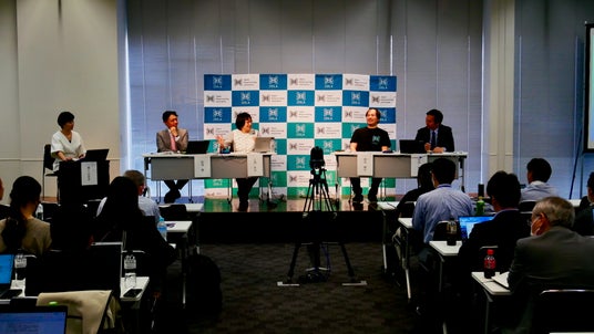 「法と技術の検討委員会」の活動について発表する登壇者ら (右から)古川氏、柴山氏、八木氏、松尾理事長