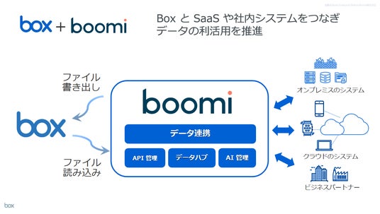 Boomiの高性能AIを搭載したデータ連携プラットフォーム「Boomi Enterprise Platform」(ブーミー エンタープライズ プラットフォーム)とインテリジェントコンテンツ管理プラットフォーム「Box」との連携機能が、2025年4月7日付で株式会社Box Japanにエコシステムソリューションとして登録され、Boxエコシステムソリューション集に掲載されました。これにより、「Box」と「Boomi Enterprise Platform」が実現するあらゆるシステム(クラウド、オンプレミスの業務システム、ビジネスパートナー)連携において、柔軟かつフルスケールな自動連携が可能となり、データの利活用が促進され業務効率化が加速します。