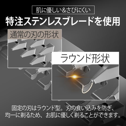 肌に触れる刃の形をラウンド型にすることによって、刃の食い込みを防いで優しく剃ることができます。素材はステンレスを使っているのでさびにくい仕様に。