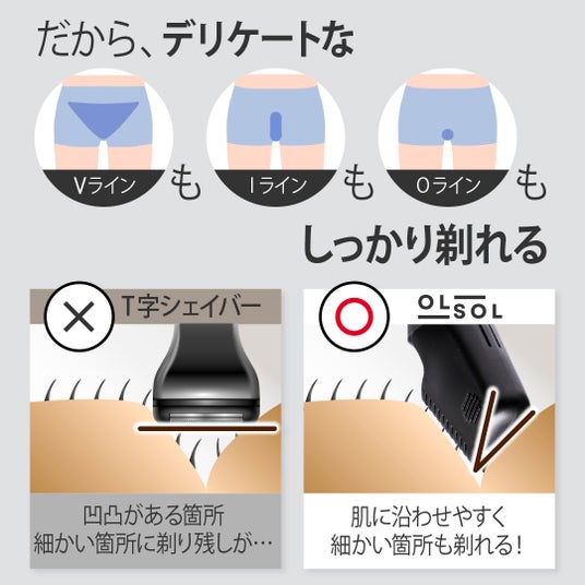 独自V字ヘッドだから、T字では剃りにくい、デリケートなVIOラインでもしっかりと剃ることができます。