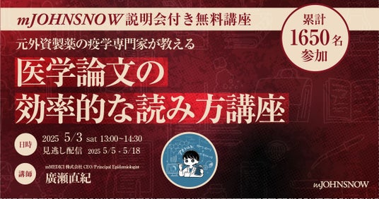 2025年5月3日(土)に、当社CEO廣瀬直紀が、前回は計810名、初回開催時は計840名もの予約をいただき、累計視聴者数1,650人を超えた大人気講座、元外資製薬の疫学専門家が教える:医学論文の効率的な読み方講座~mJOHNSNOW説明会付き~を無料開催いたします。2025年5月5日(月)~5月18日(日)の期間中の見逃し配信もございます。