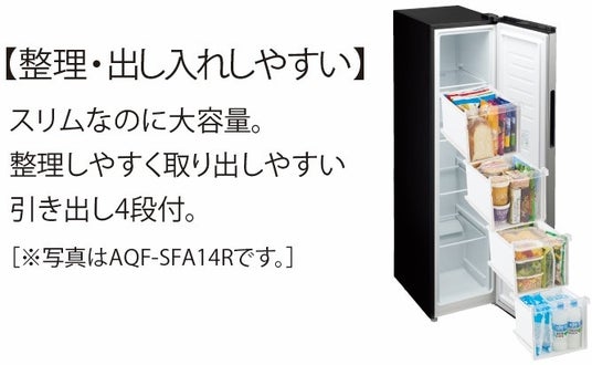 - 横幅スリムなのにたっぷり入る大容量&インテリアに馴染むデザイン- インバーター搭載のコンプレッサーを採用!省エネ設計でエコ&静音(AQF-SFA14R、AQF-SFA11Rのみ)