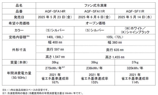 アクア株式会社(本社:東京都中央区、代表取締役社長 兼 CEO:杜 鏡国)は、横幅がスリムでキッチンやリビングのすき間に置きやすい「スリムフリーザー」シリーズの2025年モデル「AQF-SFA14R」「AQF-SFA11R」「AQF-SF11R」を、2025年5月14日(水)より順次発売します。「AQF-SFA14R」「AQF-SFA11R」は従来モデル(※1)から省エネ性能を強化(※2)(※3)し、さらにエコになりました。食品の値上げラッシュで家庭での節約意識が高まる中、当社は家計や快適な食生活への貢献を目指し、今後も冷凍庫の性能アップを図るとともに、さまざまな世帯に寄り添った幅広いラインナップを展開してまいります。