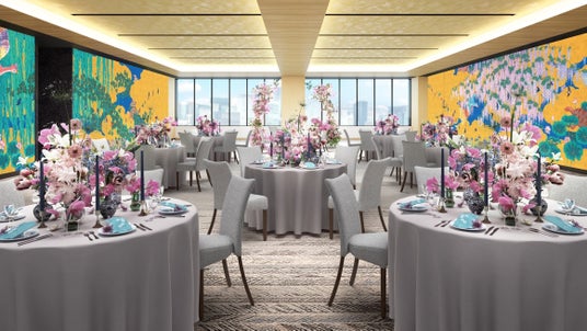 名古屋城天守閣と豊かな緑を借景にした「天守の間」は、国内最大級(最大収容人数400名)の広さを誇るラグジュアリーな会場。高さ6.6mもの金色の格天井や美しい屏風絵がゲストを別世界へと誘います。また、三方向に大きく開いた窓の向こう、庭園越しに名古屋城を眺めることができる「飛龍の間」や、ゴールドに輝く天井と左右に展開したダイナミックな屏風壁、その鮮やかな藍色が目を引く襖絵アートが印象的な「彩雲の間」などをご用意しています。ほかにも、門出を迎えられるおふたりだけでなく、ご親族にもゆっくりとお寛ぎいただける個室も整っています。