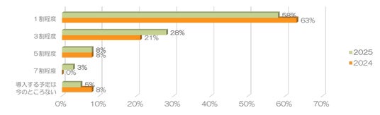 今回のアンケートでは、回答企業の管理部門におけるDX、RPA、AIなどの導入割合は「1割程度」が過半数を占める結果となり、多くの企業がデジタルやAI導入による効率化が途上であることがわかりました。