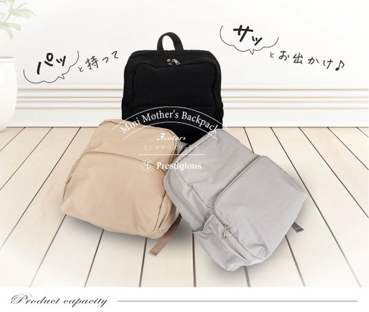 プレステージアスでは、リュックタイプとトートバッグタイプのマザーズリュックを販売しています。どのマザーズバッグも、子育て中のママスタッフのリアルな声とお客様の声から、子育てに欠かせない機能や使い心地を追求し作られました。多機能なポケットが多数装備されており、シンプルでどんな服装にも合わせやすいデザインとなっています。