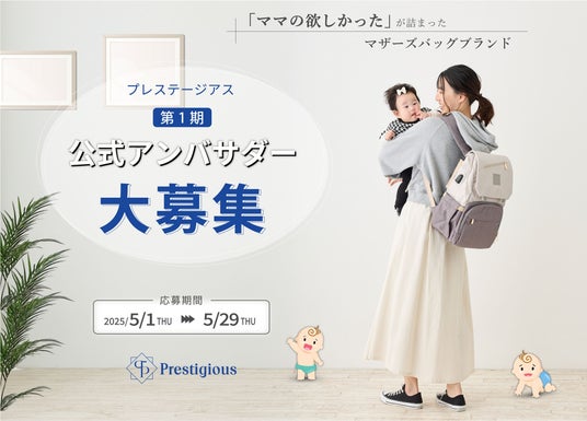 プレステージアス株式会社(所在地:神奈川県大和市 代表取締役:鈴木聖子)は2025年5月1日より、ブランド初の公式アンバサダーを募集します。「お客様一人ひとりとの出会いを大切に!商品を手に取った時に喜んでいただきたい」という思いと、一度使ったら手放せないマザーズバッグの使い心地を多くの方々へ向けて発信し、一緒にブランドを盛り上げるお手伝いをしていただきます。