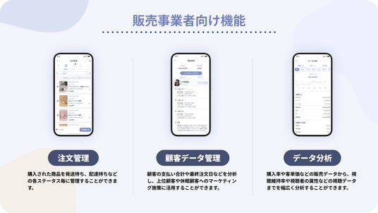 販売事業者がライブ配信を通じて消費者とリアルタイムにコミュニケーションを取りながら商品の紹介と販売を行うことができるほか、配信外でも商品購入ができるモール機能やSNSのDM機能がついていることも特長です。