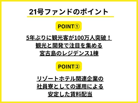 LEVECHYファンド21号は、沖縄県宮古島市の平良久貝エリアに位置する築4年のレジデンス1棟を投資対象としています。