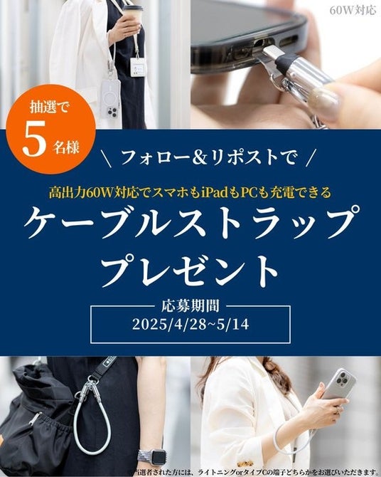 今回のキャンペーンでは、ハンドストラップとしても充電ケーブルとしても使える、便利な2Way仕様の「ケーブルストラップ」が抽選で当たります。ACアダプタと組み合わせれば、普段はおしゃれなストラップとして持ち歩きながら、必要な時にすぐ充電ケーブルとして使用可能。スタイリッシュさと実用性を兼ね備えた注目のアイテムです。