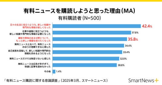 - 有料購読者が有料ニュースを購読しようと思った理由として、最も多かったのは「日々の生活に役立つ情報が欲しい」で42.4%でした。これに続き、「仕事や進路に役立つ情報が必要になった」が37.8%となりました。さらに、「趣味や興味のある分野をもっと詳しく知りたい」が35.8%となっています。有料購読者は、仕事に直結する実務的な情報だけでなく、生活に役立つ実用的な情報や、趣味を豊かにする多様な知識を求めていることがうかがえます。