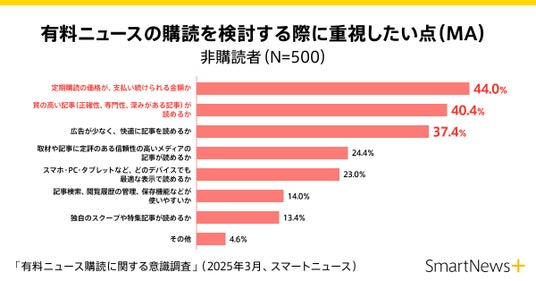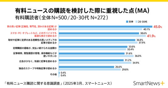 - 有料購読で重視する点は、「質の高い記事が読める」(45.0%)がトップ、「どのデバイスでも最適な表示で読める」(38.6%)が次点で、質の高いコンテンツと共に快適な閲読体験を重視
