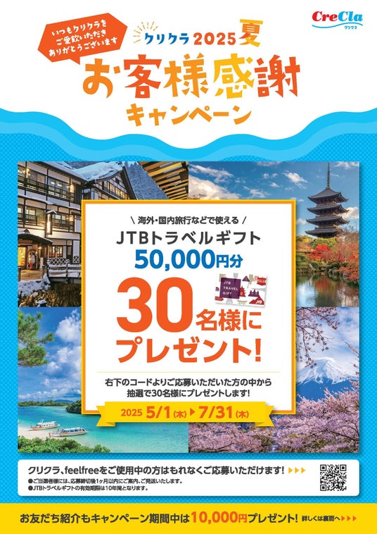 クリクラ、feel freeをご契約中のお客様の中から、抽選で30名にJTBトラベルギフト50,000円分をプレゼントいたします。