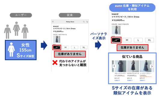 「aunn 在庫・類似アイテム」は、ユーザーが閲覧したアイテムにサイズ欠品※1が発生した場合に、代替アイテムを自動で表示する機能です。当社独自開発のAIによる画像類似判定技術と、サイズレコメンドエンジン「unisize」で取得した体型情報・ECツールが管理する在庫データを活用し、ユーザーに対して「デザインが類似している」かつ「ユーザーの体型に合うサイズが在庫にある」アイテムを自動で表示します。この機能を先行導入したアパレルECサイトでは、導入前後比でCVRが1.2倍となるなど、ユーザーの購買体験の向上に貢献していることが実証されています。
