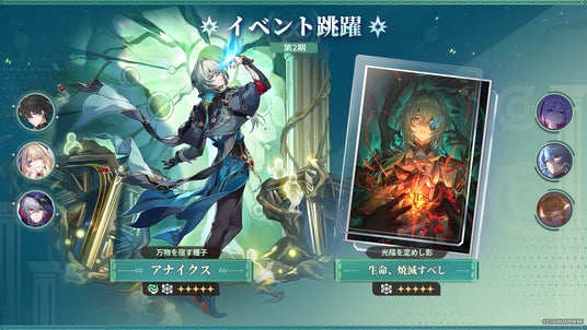 本日4月30日(水)より、イベント跳躍「万物を宿す種子」を開催しました。期間中、限定星5キャラクター「アナイクス(知恵・風)」(CV:内田雄馬)の出現率がアップします!
