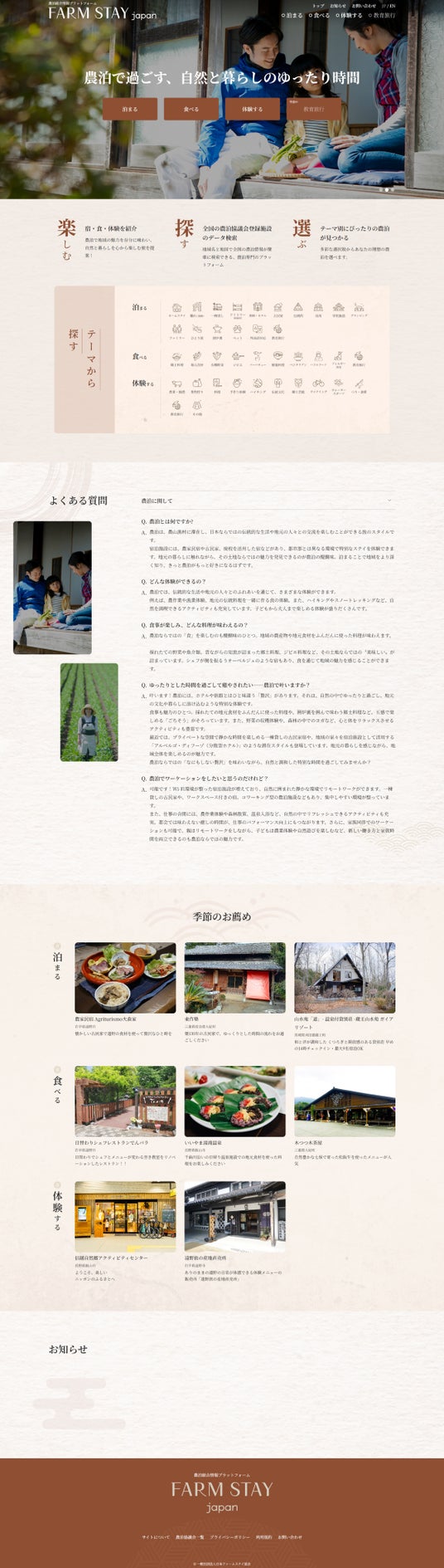 農泊情報を「泊まる」「食べる」「体験する」の3つから選べるカテゴリー検索と、細分化されたテーマ別アイコンから選ぶテーマ検索の2通りでご案内。旅行者が求める情報を簡単に見つけられる仕組みです。