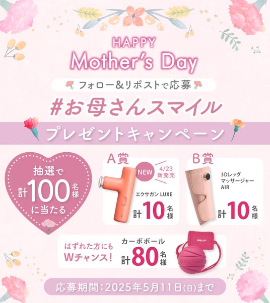 そこでドクターエアでは、お母さんに笑顔と元気を届ける1本で頭・顔・体までをケアできる人気のハンディガン《エクサガン LUXE(ラグゼ)》や、簡単・足に巻くだけでマッサージできる《3DレッグマッサージャーAIR》など、抽選で合計100名にウェルネスツールが当たる【お母さんスマイル プレゼントキャンペーン】を2025年4月30日 (水)より、ドクターエアX公式アカウントにて実施いたします。