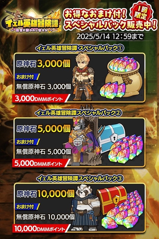 1回購入限定の「イェル英雄冒険譚~迷宮に誘われし者たち~」スペシャルパックが3種期間限定で登場!