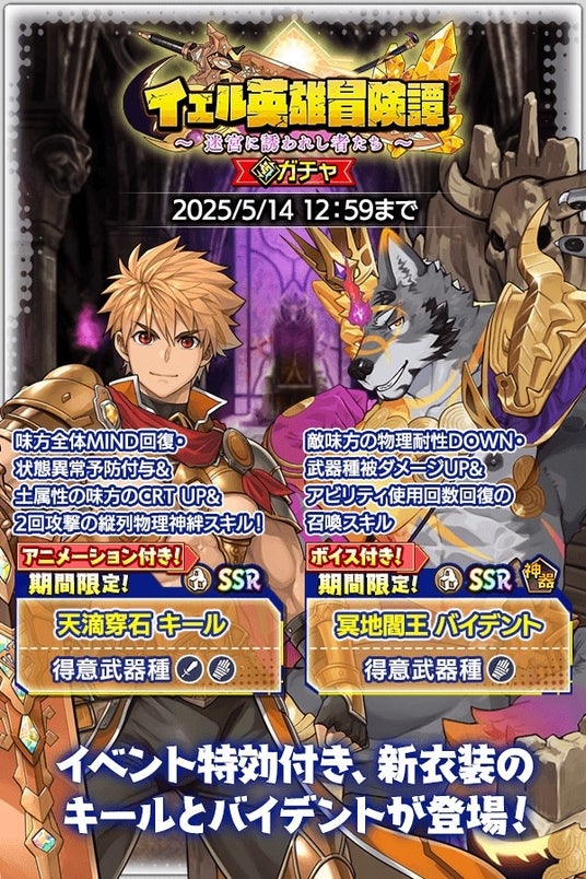 さらに、SSR魂友「天滴穿石 キール」とSSR神器「冥地閻王 バイデント」が入手可能な期間限定の「イェル英雄冒険譚~迷宮に誘われし者たち~」ガチャも登場!