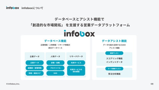 私たちは「ALL-WINNERな世界へ。」をビジョンに掲げ、買い手・売り手双方にとってより良い購買環境を実現するスタートアップです。市場リサーチ・企業リスト作成・決裁者アプローチを一気通貫で実現する営業データプラットフォーム「infobox」を開発・運営・販売しています。